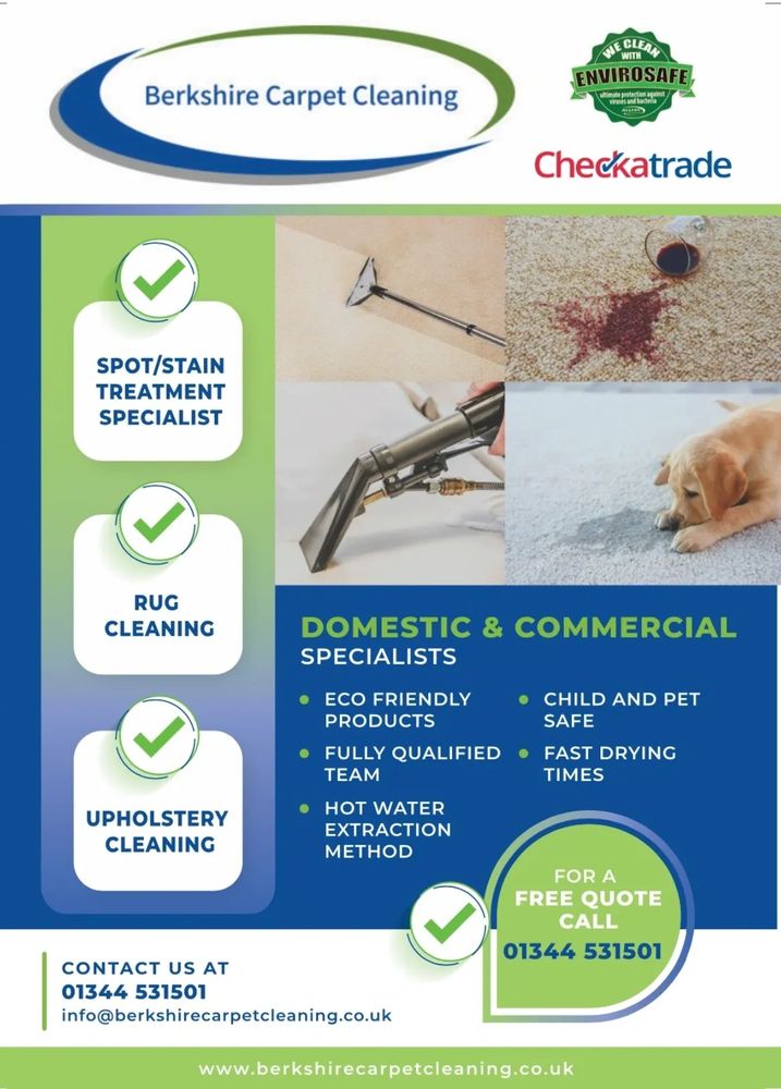 We at Berkshire Carpet Cleaning are qualified in spot and stain removal and are happy to tackle both water based and oil based stains. To help restore the PH balance, the stain has to identified. We then use products that are eco-friendly and help restore the pile to its original state.